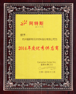 福斯特榮獲阿特斯授予的2014年度優秀供應商榮譽稱號